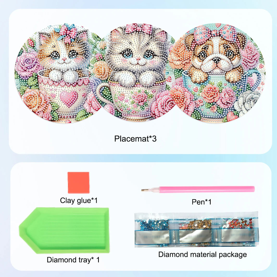Deze Diamond Painting Placemats met een speels dieren- en theekopontwerp geven elke tafel direct een warme en luxe uitstraling. De set bestaat uit drie ronde placemats die niet alleen decoratief zijn, maar ook functioneel. Ze beschermen het tafelblad tegen krassen, warmte en vlekken, terwijl ze tegelijk een echte blikvanger vormen tijdens het ontbijt, diner of een gezellig koffiemoment.