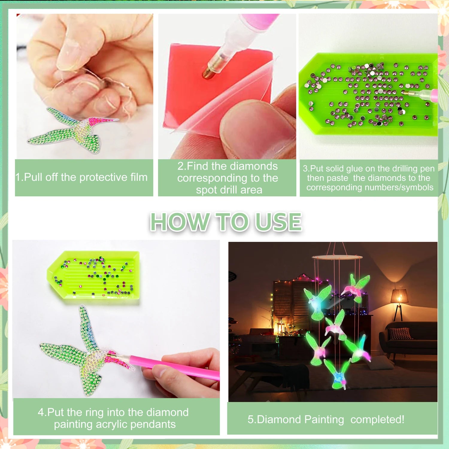 Breng een magische glans in huis met de Diamond Painting Windgong - Luminous Kolibrie. Deze prachtige windgong combineert de rustgevende klanken van een windgong met de schittering van Diamond Painting steentjes. Het ontwerp met kolibries en acrylhanger zorgt voor een sfeervolle decoratie bij het raam, op het balkon of in de tuin.