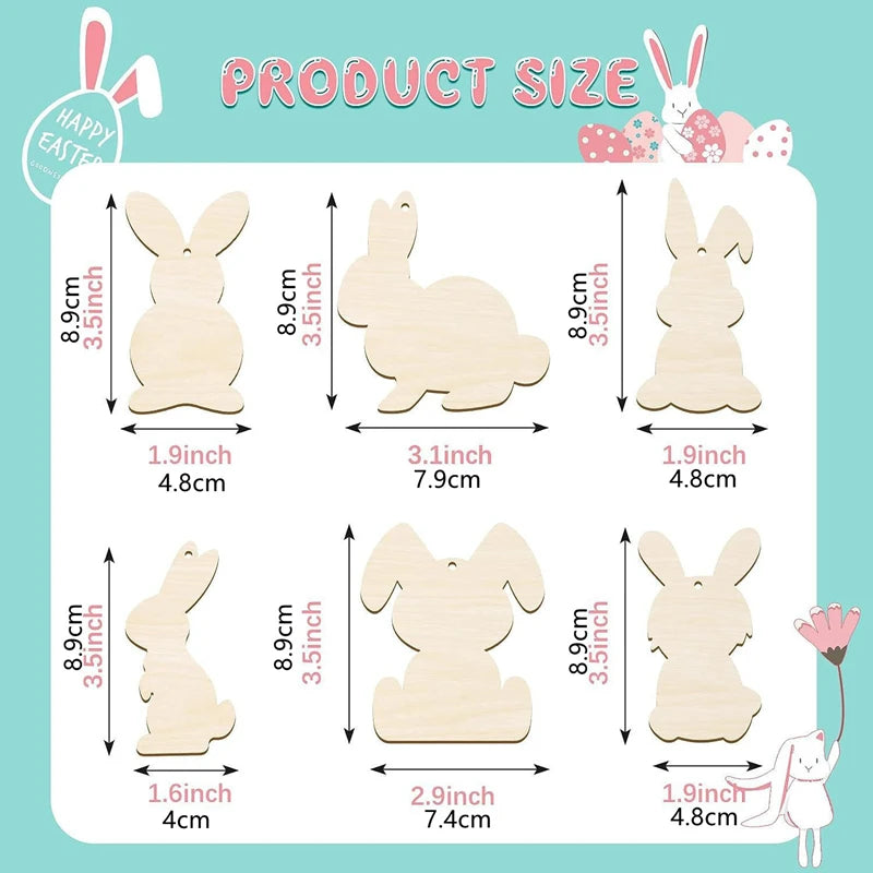 Deze houten Paasfiguren in konijnvorm zijn perfect om een persoonlijke en sfeervolle Paasdecoratie te maken. De set bestaat uit meerdere houten hangers met een glad oppervlak, waardoor ze ideaal zijn om te kleuren, schilderen of versieren met stiften en verf. Dankzij het natuurlijke hout krijgen kinderen en volwassenen alle vrijheid om hun eigen unieke Paasdecoraties te maken die perfect passen bij het interieur of de paastafel.
