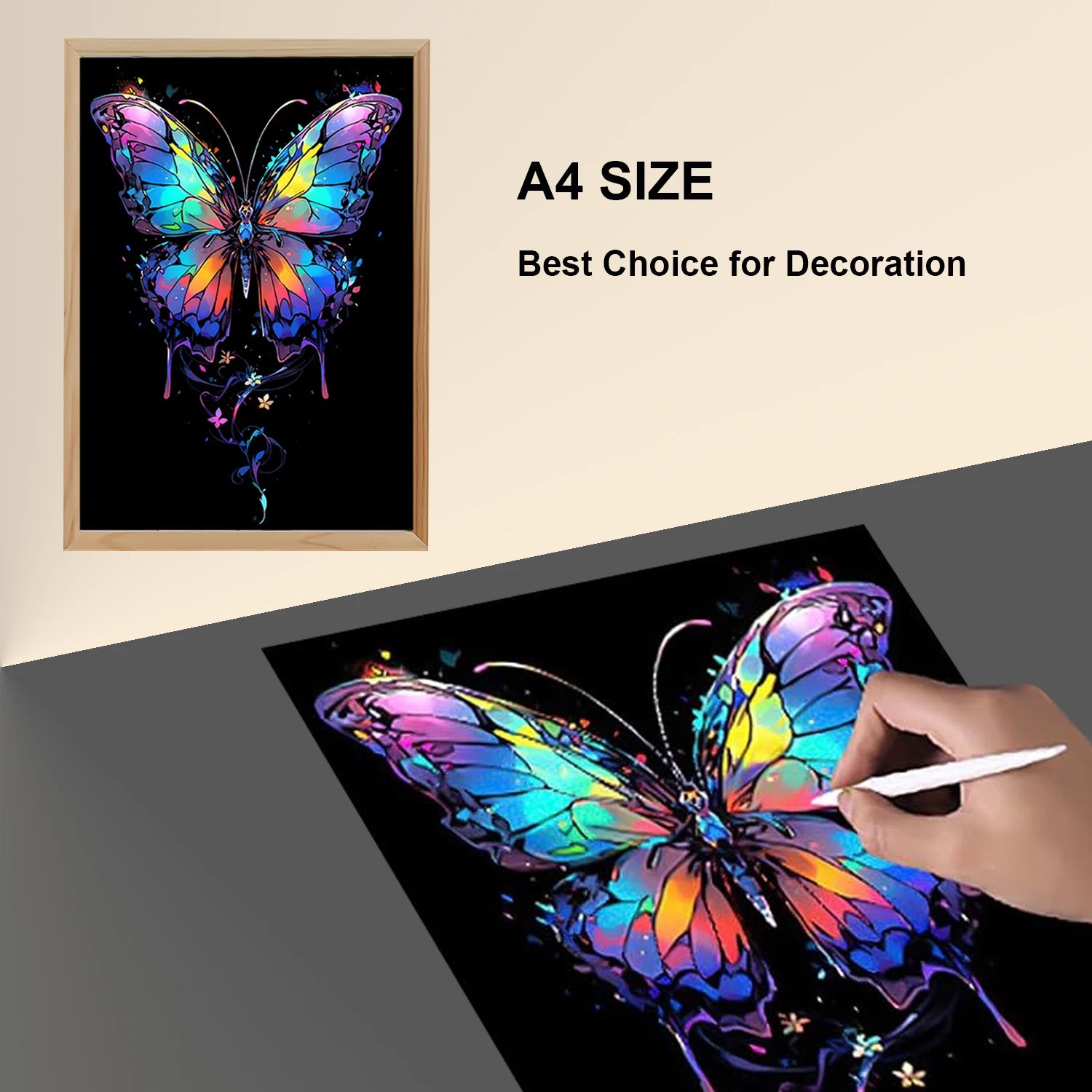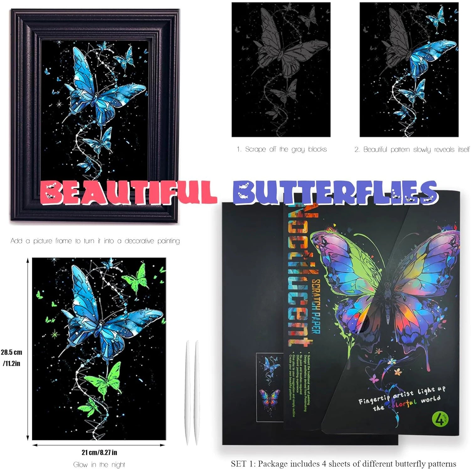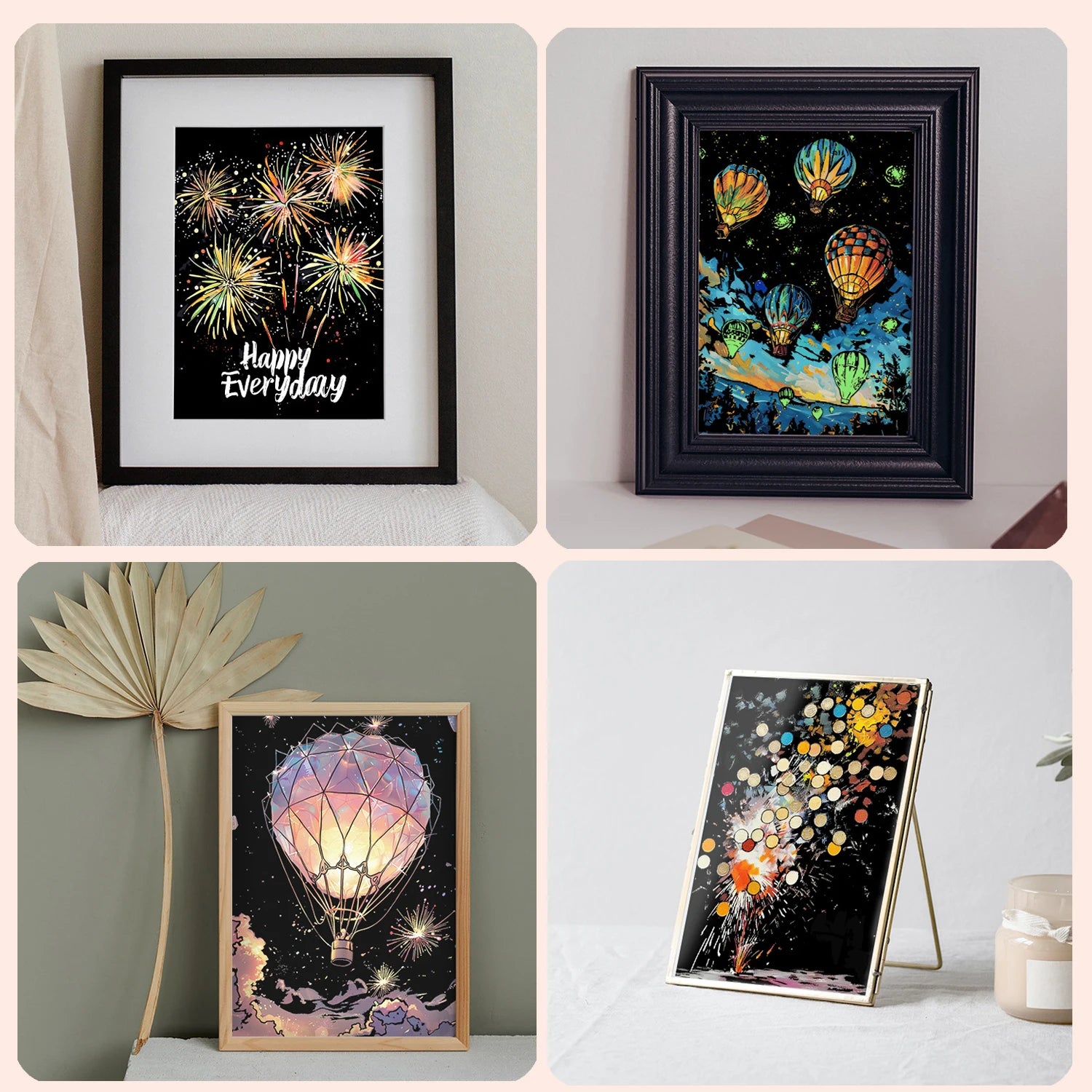 Met deze krastekening set van 4 stuks ervaar je een creatieve en ontspannende manier om prachtige kunstwerken te maken. Door met het meegeleverde krasgereedschap over het zwarte oppervlak te werken, onthul je levendige kleuren en een bijzonder lichtgevend effect dat je tekeningen een magische uitstraling geeft. Dit maakt het niet alleen leuk om te doen, maar ook schitterend om te tonen in huis.