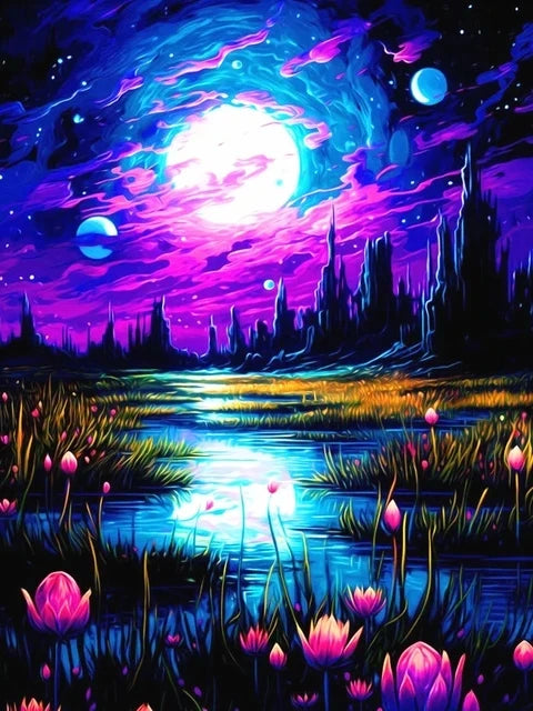 Deze schilderen op nummer set met een nachtelijke vijver brengt diepte en sereniteit in elke ruimte. Het kunstwerk toont een stille waterpartij met reflecties en donkere tinten, waardoor een elegante en moderne wanddecoratie ontstaat. De combinatie van zwarte achtergrond en levendige kleurmarkeringen zorgt voor een krachtig contrast en een professioneel ogend resultaat.