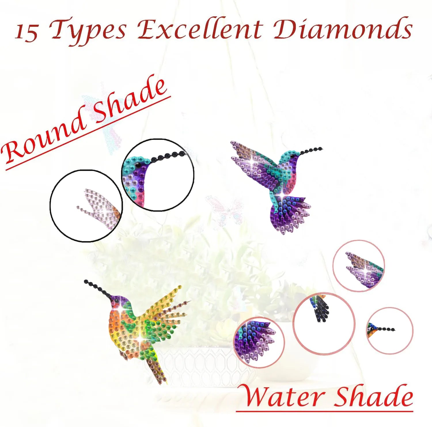 De plantenstekers zijn vervaardigd uit stevig acrylmateriaal dat bekend staat om zijn lange levensduur en heldere uitstraling. Het oppervlak is zorgvuldig afgewerkt zodat de steentjes goed blijven zitten en hun glans behouden. Hierdoor blijven de kolibries ook na langdurig gebruik een echte blikvanger, zelfs bij wisselende lichtomstandigheden.