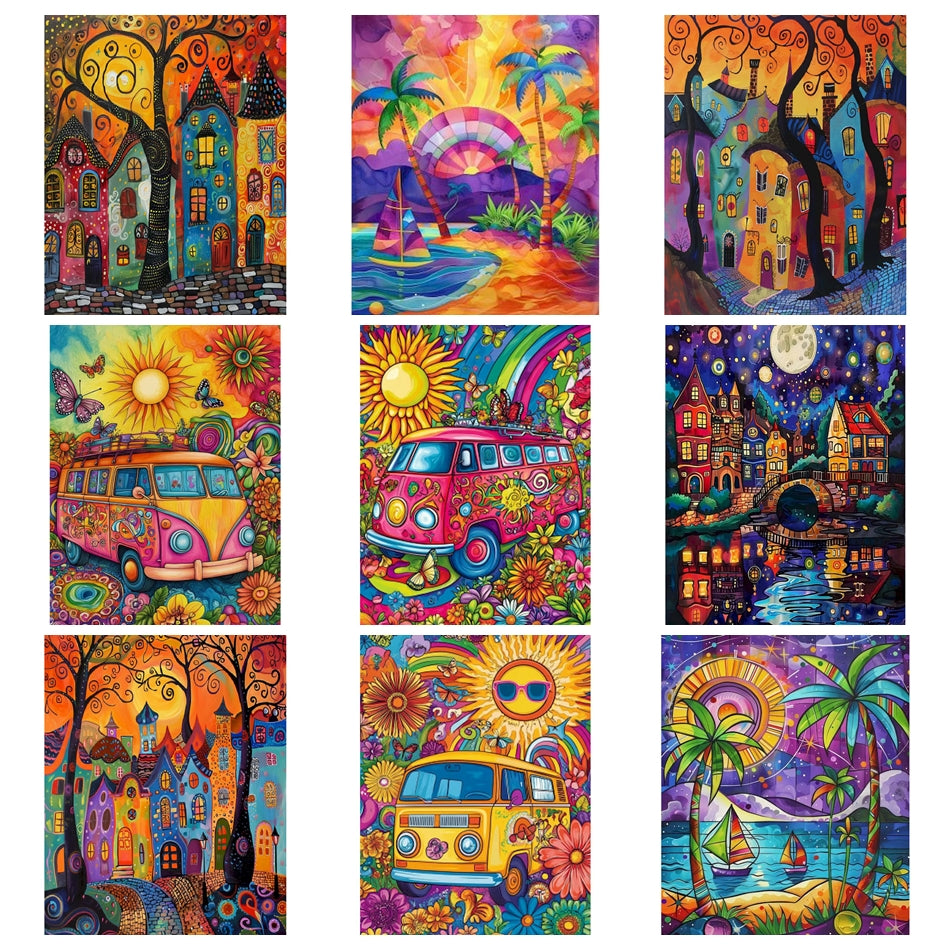 Ontdek de creativiteit van schilderen op nummer met een unieke collectie van 13 verschillende afbeeldingen. Kies uit prachtige ontwerpen met abstracte huizen, sfeervolle landschappen en karakteristieke busjes. Ideaal voor ontspanning en een geweldig eindresultaat!